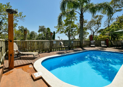 Piscina externa aquecida, agradável e equipada com cadeiras para descanso.